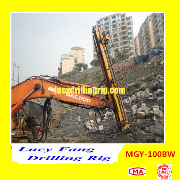 MGY-100BW full hydraulic drilling rig is developed based on DH220 excavator, specially designed to adapt to high slope, deep foundation pit construction engineering. The drilling method is mainly positive, Reverse Circulation DTH hammer drilling, and earth auger drilling as well, but also can be applied to self-drilling anchor bolt, anchor cable, deep foundation pit and tunnel pipe shed construction.